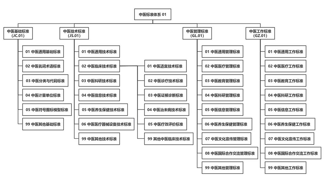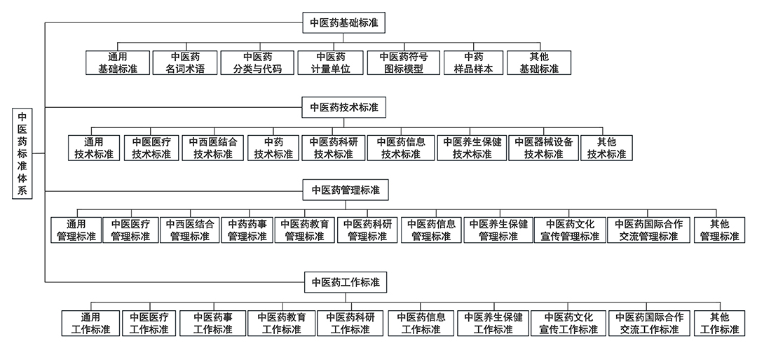 各省、自治区、直辖市中医药主管部门,新疆生产建设兵团卫生健康委,局机关各部门、直属各单位,全国中医药各专业标准化技术委员会,局中医药标准化工作办公室: 为进一步推动建立健全适合中医药发展的标准体系,促进标准化工作科学发展,清晰定位标准紧缺度、层级和优先级,我局组织制定了《中医药标准体系表(2025年版)》,现印发给你们,供指导中医药标准制修订工作。 国家中医药管理局综合司 2025年11月26日 (信息公开形式:主动公开) 中医药标准体系表(2025年版) 标准化是推进中医药治理能力和治理体系现代化的重要手段,对中医药事业高质量发展起着重要的基础性和引领性作用。构建标准体系是指导标准化工作科学发展的重要方法,对标准化工作有着重要的规划和引领作用。为进一步推动建立健全适合中医药发展的标准体系,促进标准化工作科学发展,我局组织制定了《中医药标准体系表(2025年版)》,用于指导中医药国家标准、行业标准制定紧密围绕中医药重点工作,清晰定位标准紧缺度、层级和优先级。《中医药标准体系表》是中医药领域制定标准的蓝图,也是今后一个时期编制中医药标准化规划、计划的基础和依据。 一、中医药标准体系框架设置 (一)总体结构。中医药标准体系分为基础标准、技术标准、管理标准和工作标准4个子体系,每一子体系下分为若干类目。主要的层次结构,如图1所示。